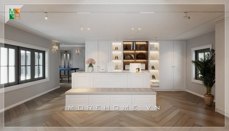 Thật tiện lợi với thiết kế nội thất phòng để đồ cao cấp theo phong cách hiện đại trẻ trung, độc đáo khi bố trí phần tủ bàn đảo kết hợp ghế ngồi trong không gian nhà phố.