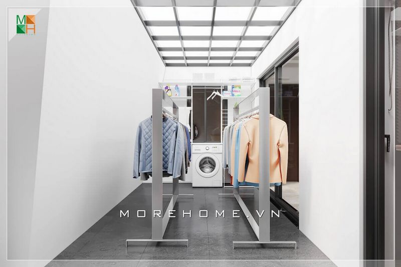 Mẫu thiết kế không gian phòng giặt phơi đồ thông thoáng hiện đại, thiết kế có mái che tránh được các trường hợp bị mưa phùn, gió bão kéo dài, không thể phơi ở trên sân.
