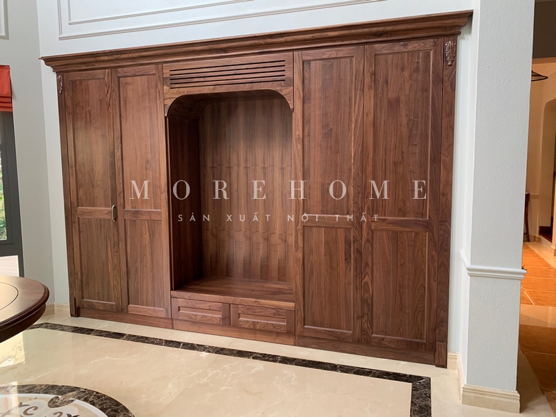 Morehome đã hoàn thành việc thi công hệ tủ gỗ trang trí nội thất cho phòng khách biệt thự 4 tầng ở Nghệ An.