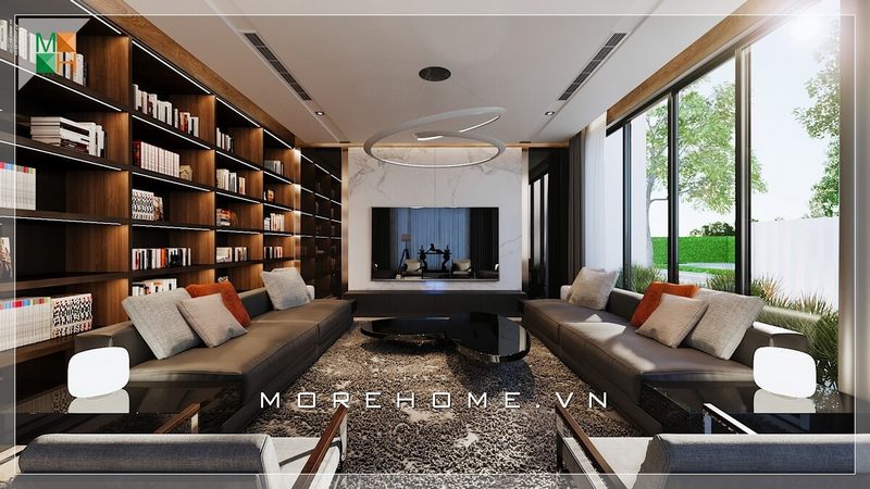 Phòng khách biệt thự hiện đại được thiết kế với nội thất gỗ tự nhiên cao cấp, mang lại sự sang trọng.